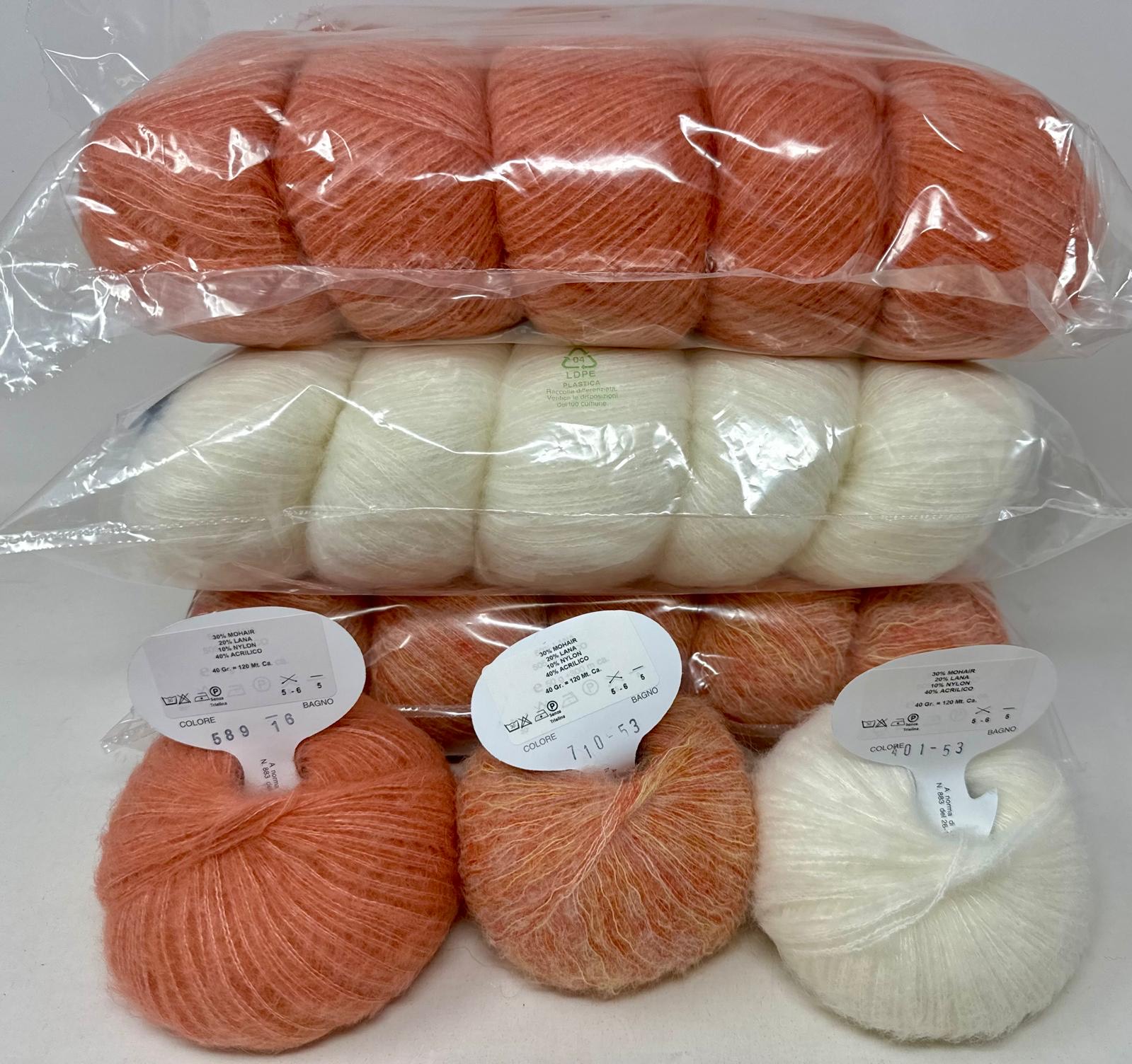 Composizione: 30% Mohair – 20% lana – 10% nylon – 40% acrilico
